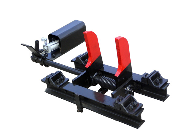 本實(shí)用新型公開了一種氣動(dòng)阻車器,包括刀擋、扭簧、力把、氣缸、軸架、軸、限位板和拉桿,軸架固定在限位板上,軸的遠(yuǎn)端穿過扭簧鉸接在軸架上,刀擋固定在軸上并與扭簧上端連接,扭簧下端固定在拉桿上,力把下端固定在軸的近端,力把上端與氣缸鉸接。該氣動(dòng)阻車器結(jié)構(gòu)簡單,安全可靠,可以人工控制,也可以遠(yuǎn)程控制,實(shí)現(xiàn)集中自動(dòng)化管理。